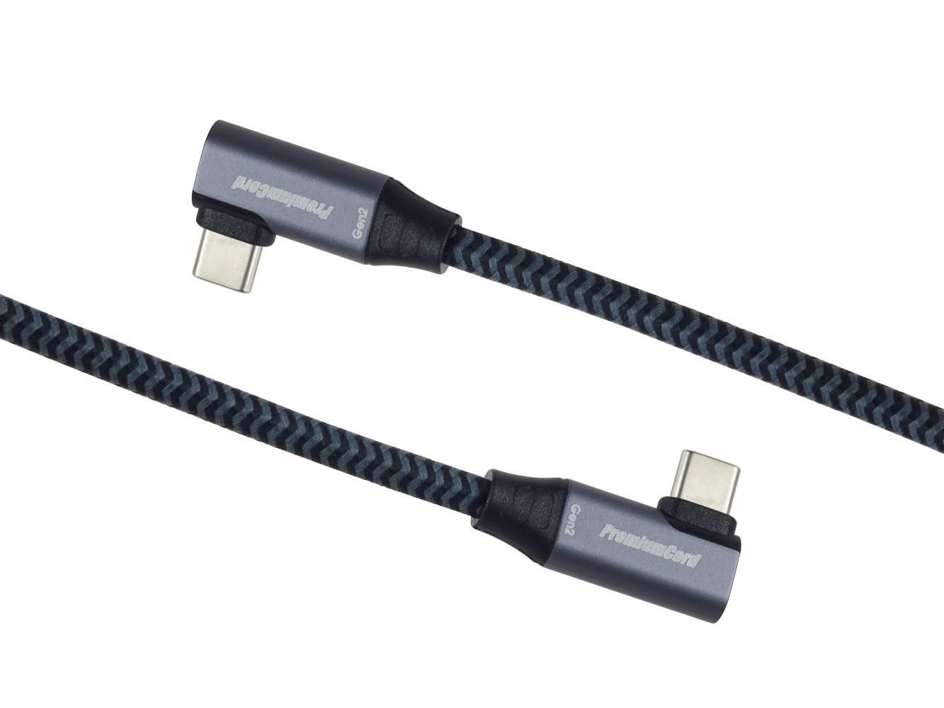 PremiumCord USB-C 2x zahnutý 90° kabel ( USB 3.2 GEN 2x2, 5A, 100W, 20Gbit/s ) hliníkové krytky konektorů, bavlněný oplet, 3m