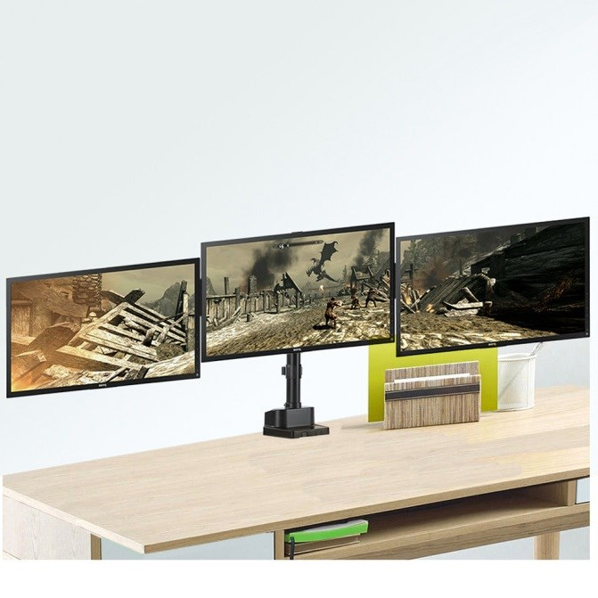 Profesionální stolní držák na 3 monitory Fiber Mounts M8C11 Plně nastavitelný kancelářský držák pro zavěšení tří monitorů 15-29", profesionální provedení, VESA 75x75 a 100x100, nosnost 21kg Profesionální systém pro uchycení a plnohodnotné polohování tří monitorů - otáčení do stran, náklon, délkové nastavení, rotace obrazovek. Držák podporuje VESA standardy 75x75 a 100x100. Maximální hmotnost monitoru 7kg (celková 21kg). Držák splní nároky každého uživatele. Profesionální stolní držák do kanceláře na 3 monitory Fiber Mounts M8C11 Technické údaje: celková nosnost 21kg (3 x 7kg) podpora VESA standardu 75x75 a 100x100 doporučená úhlopříčka monitorů 15" až 29" výškové polohování každého ramene 225mm až 575mm rotace obrazovek - možnost nezávislého otočení každého monitoru na šířku nebo na výšku nastavení vzdálenosti krajních monitorů možnost nastavení monitorů do příčky nebo do paraboly uchycení na stolové desky o průměru 10mm až 50mm stolový úchyt má integrované přípojky USB 3.0 systém vedení kabeláže materiál hliník a ocel barevné provedení černé záruka 5 let Stolní držák na 3 monitory Fiber Mounts M8C11 Držák na 3 monitory M8C11 podporuje VESA standardy: VESA 75x75 VESA 100x100 Profesionální držák na tři monitory s plnohodnotným polohováním. Držák je vhodný do kanceláří, pracoven, firem ale i domácnosti..