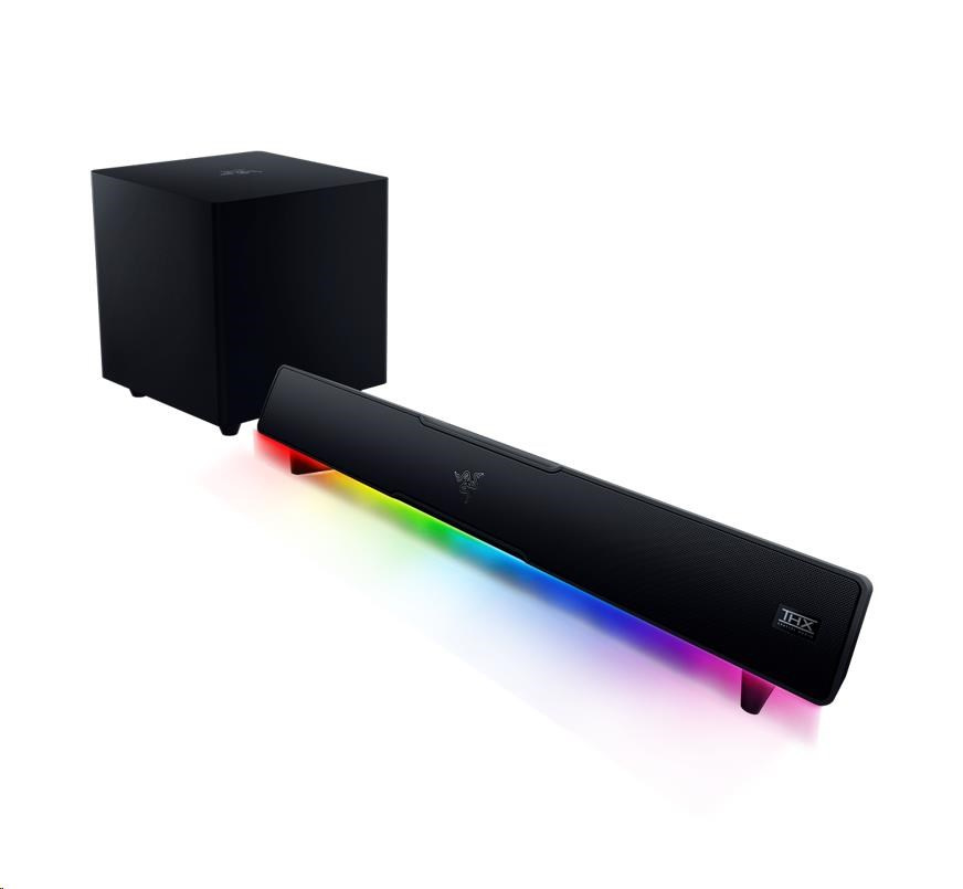 | OTHERS | Razer Chroma™ RGB (18 zones) THX Spatial Audio (PC based via Synapse 3) Bluetooth 5.2 (60ms low latency) USB audio input Razer Audio app Razer Chroma RGB app Custom 10-band EQ Raised feet on soundbar Headphone quick toggle Dimensions: Soundbar: 19.7 x 3.6 x 3.3" / 500 x 91.3 x 84 mm Subwoofer: 8.67 x 8.67 x 9.5" / 220 x 220 x 241.5 mm |