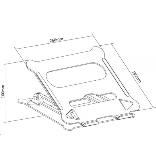 ERGOnomický hliníkový stojan na laptopy nebo tablety max 5kg pro dosažení optimálního nastavení náklonu a výšky 11-15" monitoru, přenosné provedení na stůl s protiskluzovými plochami a otvory pro ventilaci, pro použití externí klávesnice, rozměry 26x23x16 cm, barva stříbrná.
