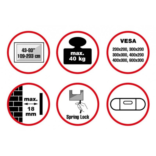 Nástěnný ocelový držák na OLED TV s uhlopříčkou 43"- 80" (109-203cm, různá tloušťka) a hmotností maximálně 40kg. Konzole na zavěšení TV s vodováhou, není vertikálně výklopný, max. vzdálenost od stěny 18mm, materiál ocel, zámek Spring Lock s páskou, cenově výhodné, barva černá. Uchycení VESA: 200x200, 400x200, 300x300, 400x200, 400x300, 600x300..