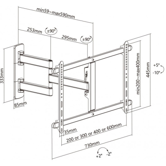 Nástěnný ocelový držák s bočním natáčením na TV s uhlopříčkou 37"- 80" (109-203cm) a hmotností maximálně 50kg. VESA max 600x400, 3x pant, vertikálně výklopný +5°/-10° a horizontálně otočný +90°/-90°, vzdálenost od stěny 59-590mm, Cable Managment, barva bílá. Uchycení VESA: 200x200, 300x200, 400x200, 300x300, 400x300, 400x400, 600x400. Direction indikátor, jemné nastavení polohy oproti fixaci ve zdi +2°/-2°, rozměry 590 x 730 x 445 mm..