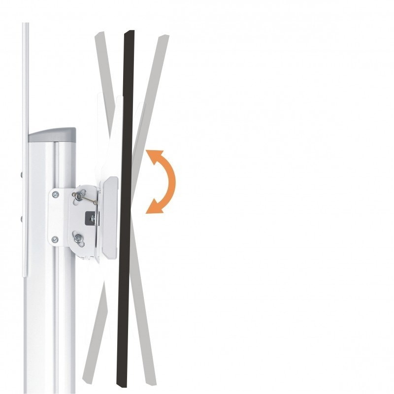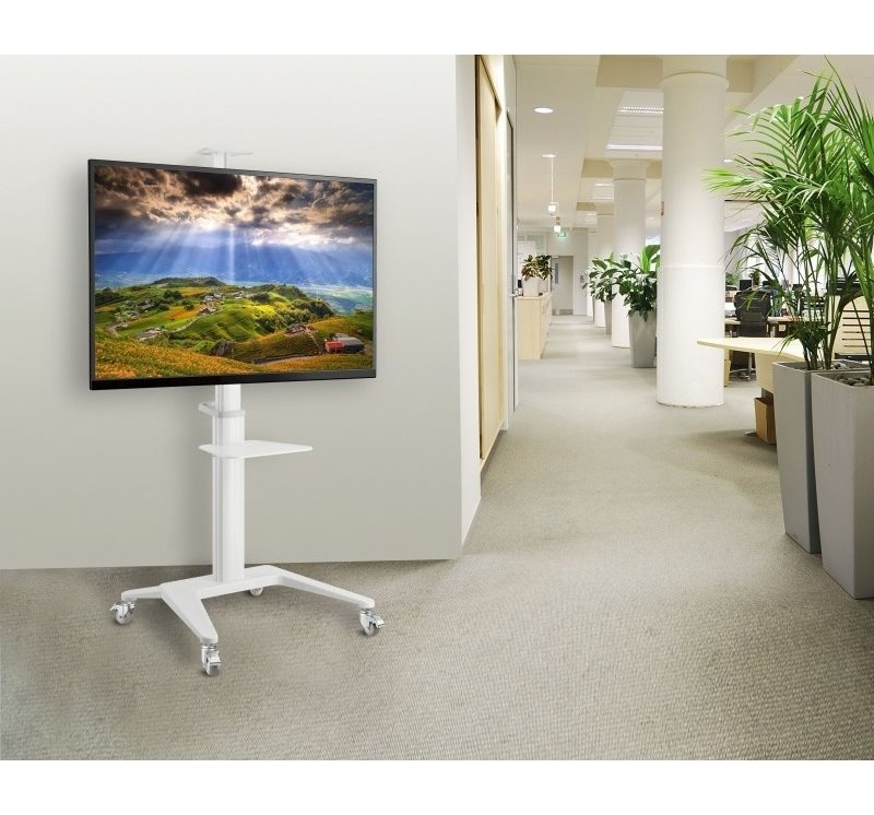 Televizní stolek na velké LCD TV s uhlopříčkou 37"- 70" (94-178cm) a hmotností maximálně 50kg. Středový nosný profil 125-160cm na kolečkách s aretací, držák výklopný +5°/-12°, horní výškově nastavitelná otočná plocha pro kameru max 5kg , polička 34x46cm max 5kg, Alu/ocel, barva bílá. Uchycení VESA: 200x200, 300x300, 400x200, 400x400, 600x400..