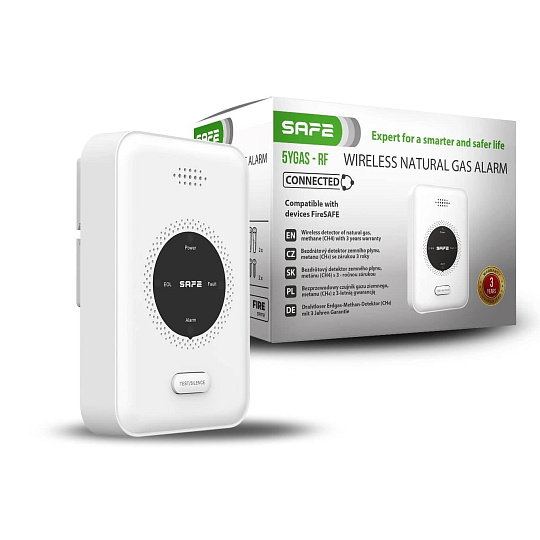 Polovodičový integrovaný senzor bezdrátového detektoru splňuje nejvyšší Evropské bezpečnostní standardy a je certifikován a kalibrován na základě normy EN 50194 (norma pro elektrická zařízení k detekci hořlavých plynů) bez další potřeby vyžadující pravidelné servisní kalibrace. Senzor druhé generace provádí nepřetržité testování ovzduší na přítomnost nebezpečné úrovně koncentrace plynů v monitorovaném prostoru. Přístroj je řízen moderním mikroprocesorem, který při zjištění nebezpečné úrovně plynu ihned vyšle rádiový signál a aktivuje jak vizuální, tak akustický poplach. Tím SAFE 5YGAS – RF poskytuje včasné varování před únikem plynu a přispívá k maximální ochraně vašeho domova.