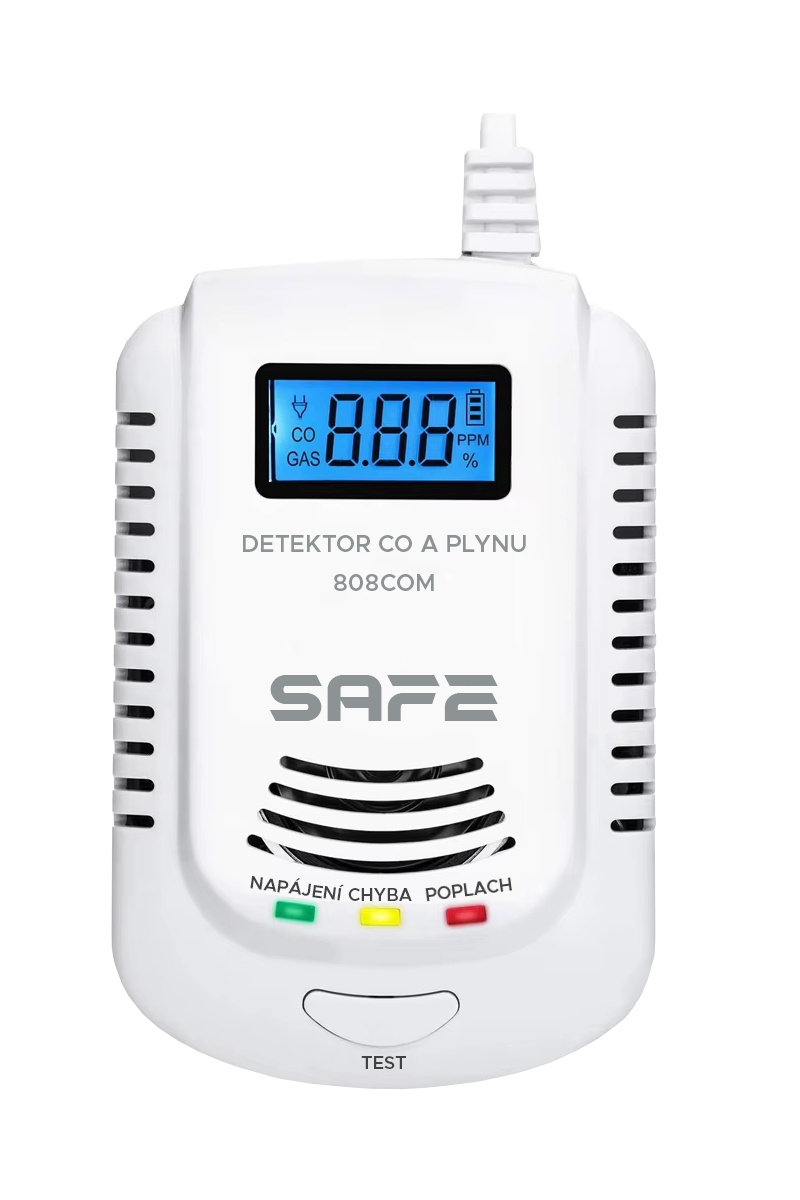 SAFE 808COM představuje hardwarově inovovanou verzi inteligentního kombinovaného detektoru vybaveného nejnovější technologií elektrochemického a polovodičového, multifunkčního senzoru druhé generace pro detekci a včasné varování před výskytem oxidu uhelnatého (CO) a takřka všech hořlavých, výbušných plynů (zemní plyn, metan, propan, butan). Zařízení vyniká stabilitou, vysokou citlivostí a dlouhou životností dvojice senzorů.