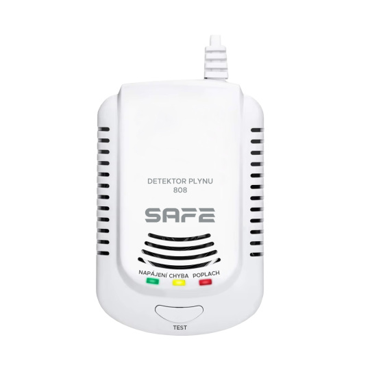 Detektor je vybaven tlačítkem TEST s funkcí, která slouží k umělému simulování přítomnosti plynu a umožňuje ověření provozuschopnosti vnitřních obvodů prostřednictvím automatického monitorovacího systému účinnosti.Hlásič plynu SAFE - 808 se ideálně hodí pro detekci úniku plynu ze všech domácích plynových spotřebičů a plynových kotlů. Detekuje všechny hořlavé plyny běžně se vyskytující v domácnostech.