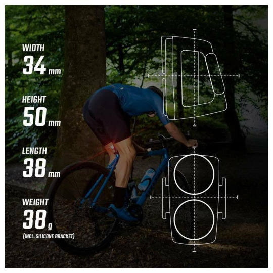 Světlo se zapíná dvojitým stisknutím. Velké tlačítko zapnutí lze snadno ovládat i v rukavicích. Tato funkce zajistí, že zadní světlo lze bez problémů schovat do kapsy dresu nebo do batohu, aniž by se nedopatřením rozsvítilo.