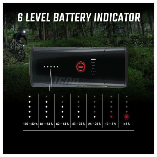 6 světelných režimů: High (1600 lm), Mid (1100 lm), Low (500 lm), Eco (150 lm), Night Flashing (800/400 lm), Day Flashing (200 lm)