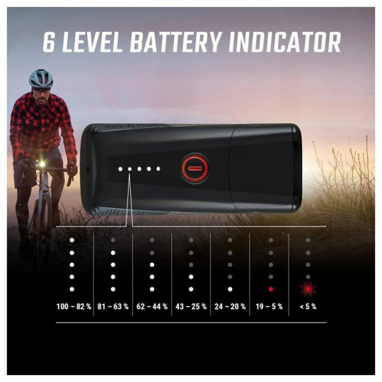 Stiskem ovládacího tlačítka se na třístupňovém indikátoru baterie zobrazí, kolik energie v baterii ještě zbývá. Lze tak v případě potřeby přepnout do úspornějšího světelného režimu.