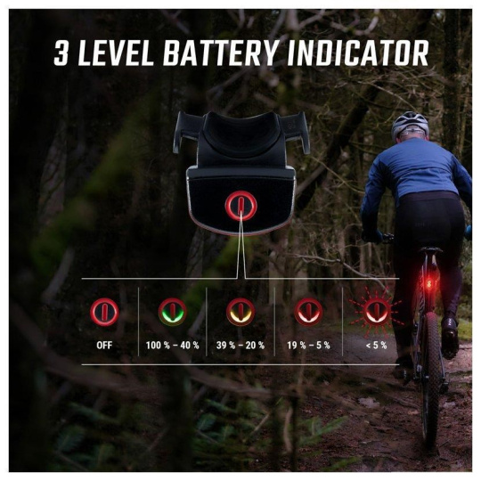 Světlo se zapíná dvojitým stisknutím. Velké tlačítko zapnutí lze snadno ovládat i v rukavicích. Tato funkce zajistí, že zadní světlo lze bez problémů schovat do kapsy dresu nebo do batohu, aniž by se nedopatřením rozsvítilo.