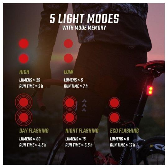 5 světelných režimů: High (25 lm), Low (5 lm), Day Flashing (80 lm), Night Flashing (15 lm), Eco Flashing (5 lm)