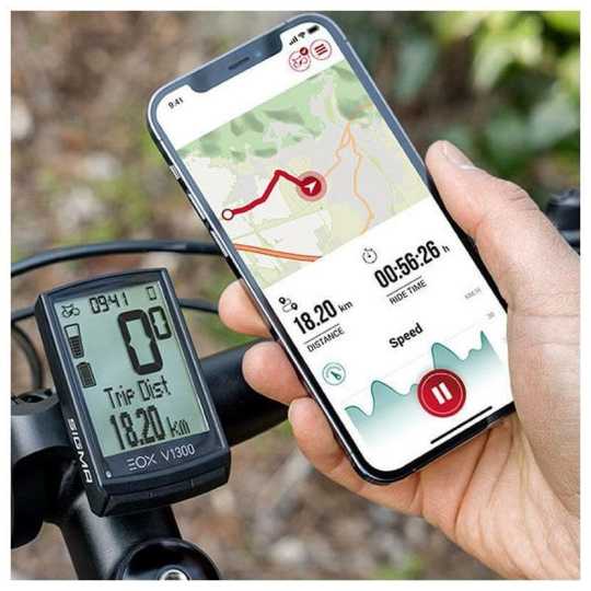 Propojením cyklopočítač EOX® VIEW 1300 s bezplatnou aplikací EOX® App na chytrém telefonu lze zaznamenávat a vyhodnocovat jednotlivé své vyjížďky. Kromě toho lze procházet shrnutí zaznamenaných vyjížděk, včetně týdenních, měsíčních a ročních statistik vzdálenosti a doby jízdy. Tyto statistiky odhalí, zda se uživateli podařilo dosáhnout stanovených cílů. Lze se také pochlubit se svými úspěchy přátelům na sociálních sítích. Data je možno také zdarma zálohovat na platformě SIGMA CLOUD.