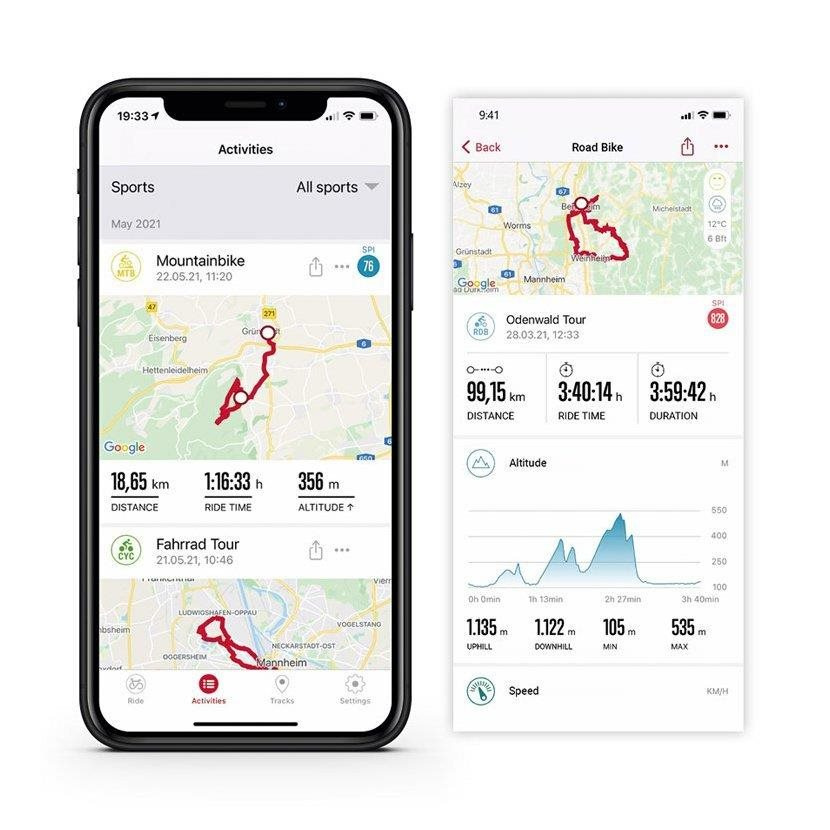 Na ROX 11.1 EVO jsou již nainstalovány čtyři profily, kterých však může být až 20. Můžete si vytvořit své vlastní sportovní profily a využívat tak svůj ROX 11.1 pro různé aktivity. Pomocí aplikace SIGMA RIDE lze individuálně konfigurovat a barevně zvýrazňovat šest různých tréninkových obrazovek až se šesti datovými poli. Tak budete mít dokonalý přehled o svých osobních cílech. Další obrazovky jsou nainstalovány prostřednictvím komoot pro trénink, trasu a navigaci. Pro chytré trenažéry připojené přes FE-C lze načíst další datovou obrazovku. ROX 11.1 lze propojit s chytrým telefonem a sledovat tak své výkony okamžitě na Live Screen aplikace SIGMA RIDE.