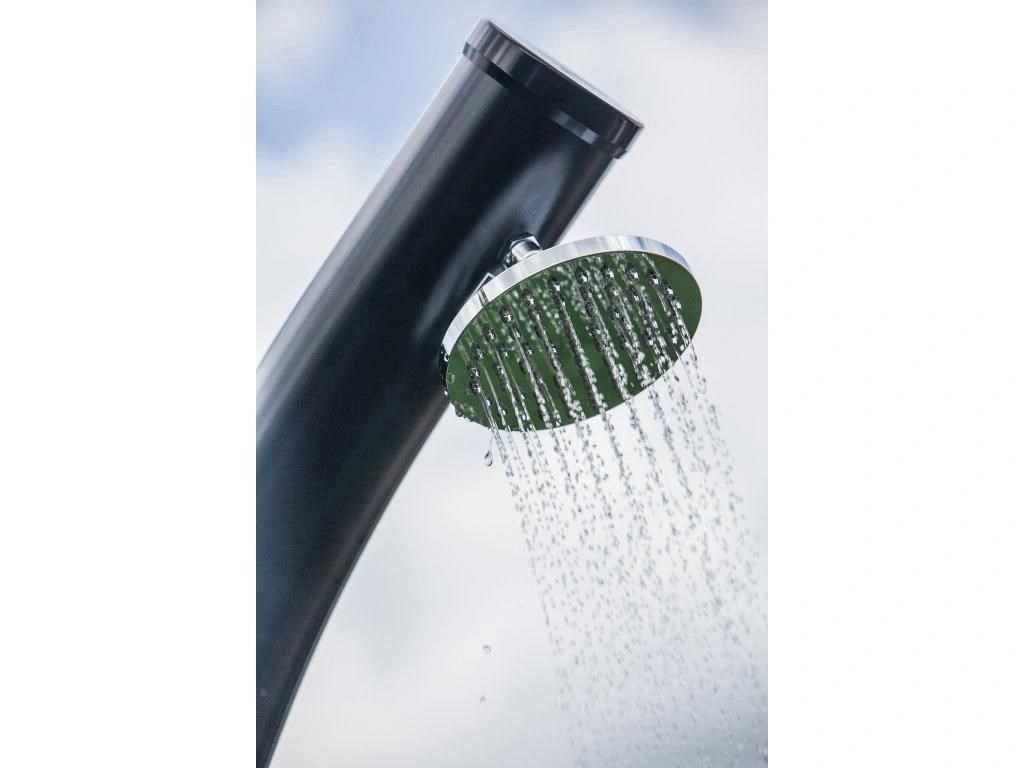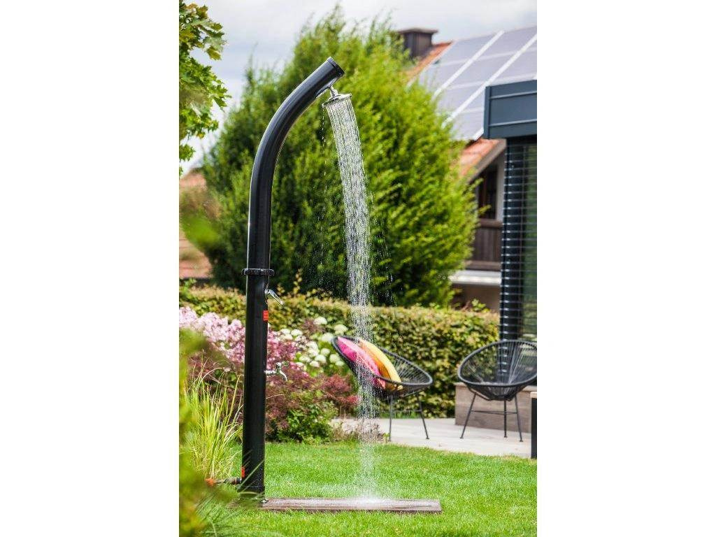 Designová solární sprcha s velkou sprchovací hlavicí, která zajišťuje příjemné sprchování připomínající lehký letní deštík. Elegantně zahnuté tělo sprchy, které vkusně zapadne do každé zahrady. Sprcha je vyrobena z kvalitního PVC odolného vůči UV záření, má zásobník o objemu 20 l a výšku 215 cm. Připojení na přívod vody je velmi jednoduché pomocí hadicové rychlospojky (součástí balení). Sprcha je dvoudílná, takže ji lze lehce složit a převézt na jiné místo.