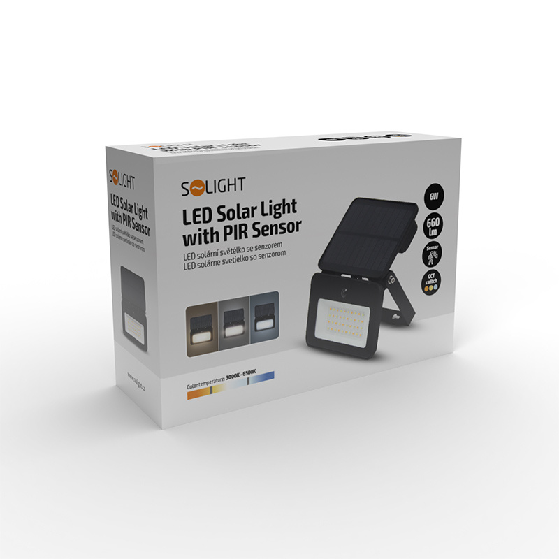 Solight LED solární reflektor se senzorem, 6W, 660lm, 3CCT, Li-Ion, černá