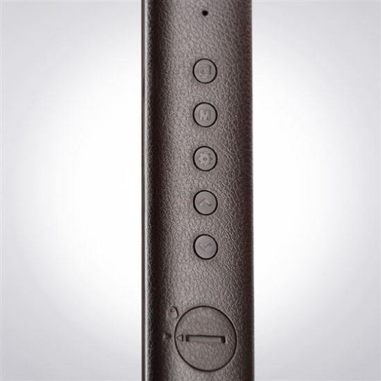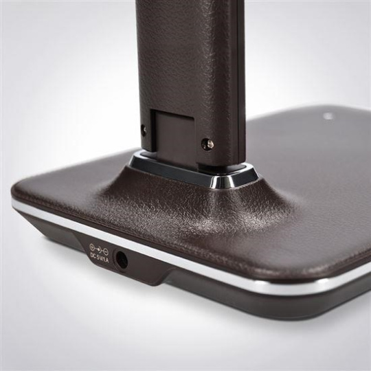 Stolní lampička s LED světelným zdrojem a designem hnědé kůže, možnost volby 3 barev světla – teplá, neutrální bílá a studená bílá (3000K-6000K), stmívatelná – 5-stupňové stmívání, displej s funkcí času, kalendáře, budíku a teploměru, příkon světla: max. 9W, světelný tok: max. 500lm, úhel svícení: 120°.... více