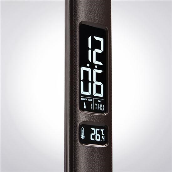 Stolní lampička s LED světelným zdrojem a designem hnědé kůže, možnost volby 3 barev světla – teplá, neutrální bílá a studená bílá (3000K-6000K), stmívatelná – 5-stupňové stmívání, displej s funkcí času, kalendáře, budíku a teploměru, příkon světla: max. 9W, světelný tok: max. 500lm, úhel svícení: 120°.... více