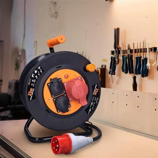 Robustní prodlužovací přívod na bubnu s délkou 25 metrů, jednou zásuvkou na 400 V a dvěma zásuvkami na 230 V je ideální volbou pro napájení stavebních strojů, profesionálního nářadí nebo dílenského vybavení. Díky kabelu z měkčené pryže a krytí IP44 je vhodný i do náročných podmínek na stavbách nebo v průmyslu. Samovolnému navíjení brání integrovaná aretační brzda.
