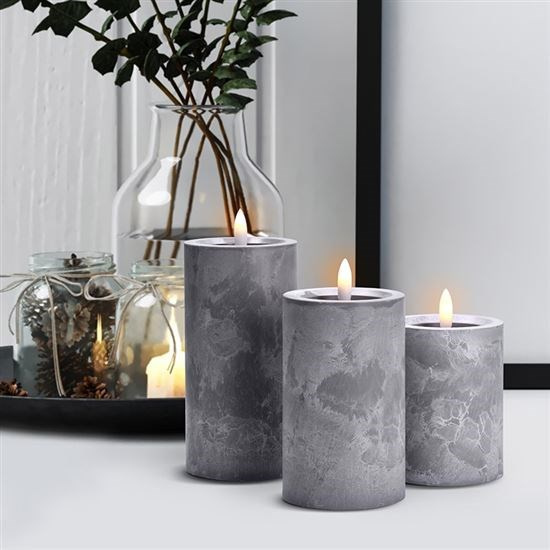 Vytvořte si elegantní atmosféru s LED svíčkami s efektem přirozeně blikajícího plamene a luxusním dekorem šedého mramoru. Tato sada tří svíček vnese do vašeho interiéru moderní a útulný vzhled bez nebezpečí otevřeného ohně.
