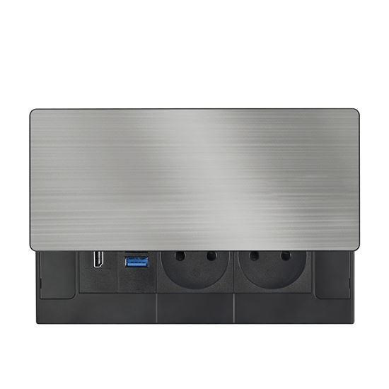 Tento vestavný blok zásuvek nabízí více než jen napájení – kombinuje dvě síťové zásuvky 230 V, USB rychlonabíječku a HDMI port v jednom kompaktním modulu. Vrchní kryt z matné tmavé nerez oceli (inox) s posuvným mechanismem se snadno začlení do moderního interiéru pracovních stolů, prezentačních prostor i obývacích pokojů. Díky kabelu o délce 2 metry je instalace flexibilní a pohodlná.