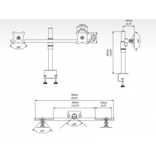 Technické údaje: max. zatížení 20kg na monitory a tv o úhlopříčce 17" až 27" VESA standart 75x75 a 100x100 nezávislé nastavení každé obrazovky náklon nahoru i dole +/- 60° otáčení do stran +/- 90° posun obrazovky v ose držáku - nastavení vzdálenosti mezi monitory výška držáku 405mm nastavení požadované výšky dle potřeby volba typu uchycení dle vaší potřeby volitelná barva - černá nebo stříbrná záruka 5 let.
