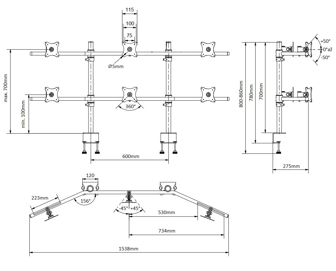 Stolní držák na 6 monitorů Edbak SV17 Stolní držák na 6 monitorů nebo televizorů s úhlopříčkou 17"-27", parabola, plně nastavitelné pozice monitorů, profesionální kvalita, VESA standardy 75x75 a 100x100, barva černá, nosnost 60kg Profesionální parabolický stolní držák na 6 monitorů 17-27". Nastavitelná poloha každého monitoru dle potřeby: otáčení do stran, naklápění, korekce roviny, pivot, posun do stran. Nastavení potřebné výšky vodorovných nosníků s monitory. V balení najdete 2 typy stolních úchytů: svěráky na uchycení na okraje stolů nebo šroubovici pro uchycení do průchodek. Systém vedení kabeláže. Nejvyšší kvalita, silnostěnný materiál. Podpora VESA standardů 75x75 a 100x100, barevné provedení černé, nosnost 60kg. Záruka 10 let. Profesionální stolní držák na 6 monitorů v parabole Edbak SV17 Technické údaje: nosnost 60kg na monitory s úhlopříčkou 17" až 27" VESA standardy 75x75mm a 100x100mm polohování vzdálenosti monitorů mezi sebou 223mm nastavení sklonu +/- 50° otáčení monitoru do stran +/-45° funkce pivot uchycení na stolové desky o síle 10-55mm (průchodka) nebo 10-80mm na okraj stolu nejvyšší kvalita, silnostěnný materiál, profesionální výrobek velmi snadná a rychlá montáž barva černá záruka 10 let Držák na 6 monitorů displejů Edbak SV17 Stojan na 6 monitorů Edbak SV17 podporuje VESA standardy: VESA 75x75 VESA 100x100 možnost zakoupení rozšíření na VESA 200x100 a 100x200 možnost zakoupení rozšíření na VESA 200x200.