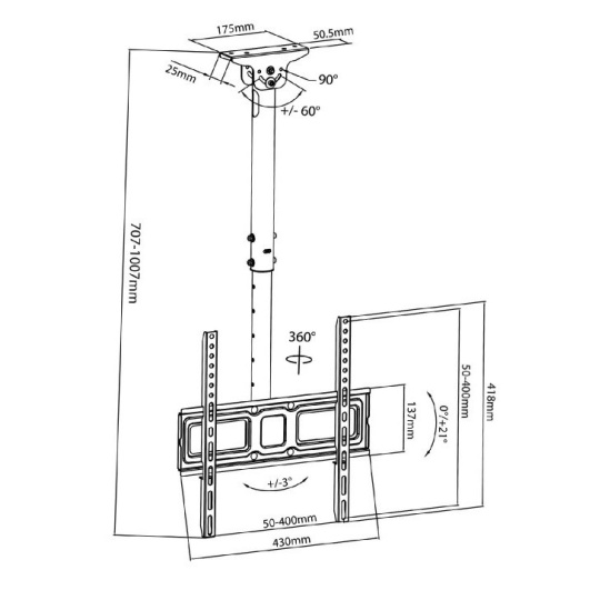 Stropní výsuvný držák na Tv Fiber Mounts M9C43 Stropní (nástěnný) držák na Tv 32-60", nastavení délky 717-1017mm, naklápění 0-21°, VESA 75x75 až 400x400, nosnost 35kg Kvalitní stropní držák na televize nebo monitory s úhlopříčkou 32-60". Držák má nastavitelnou délku od 717mm do 1017mm, umožňuje otáčení a naklápění Tv, uchycení je možné na rovné i šikmé stropy (nebo podkrovky), případně i na stěnu nebo bok stropního trámu - stropní úchyt je variabilní a umožňuje velké úhlové polohování. Veškerou kabeláž snadno ukryjete do těla držáku. Podpora VESA 75*75 až 400*400, nosnost 35kg. Materiál ocel, dodáváno včetně instalačního materiálu. Kvalitní ale levný stropní držák na Tv 32-60" s nastavením délky, otočný a sklopný Fiber Mounts M9C43 Technické údaje: nosnost 35kg podpora VESA standardů 75*75 až 400*400 vhodný na televize i monitory s úhlopříčkou 32-60" nastavitelná délka držáku 717-1017mm naklápění 0° až 21° korekce roviny +/- 3° otočný +/- 180° uchycení na rovné nebo šikmé stropy, na stěny nebo svislé povrchy systém pro skryté vedení kabeláže materiál ocel instalační materiál barevné provedení černé záruka 5 let Úhlově polohovatelný úchyt stropního držáku Tv Fiber Mounts M9C43 Držák podporuje VESA standardy: VESA 75*75 VESA 100*100 VESA 200*100 a 100*200 VESA 200*200 VESA 300*200 a 200*300 VESA 300*300 VESA 400*200 a 200*400 VESA 400*300 a 300*400 VESA 400*400.