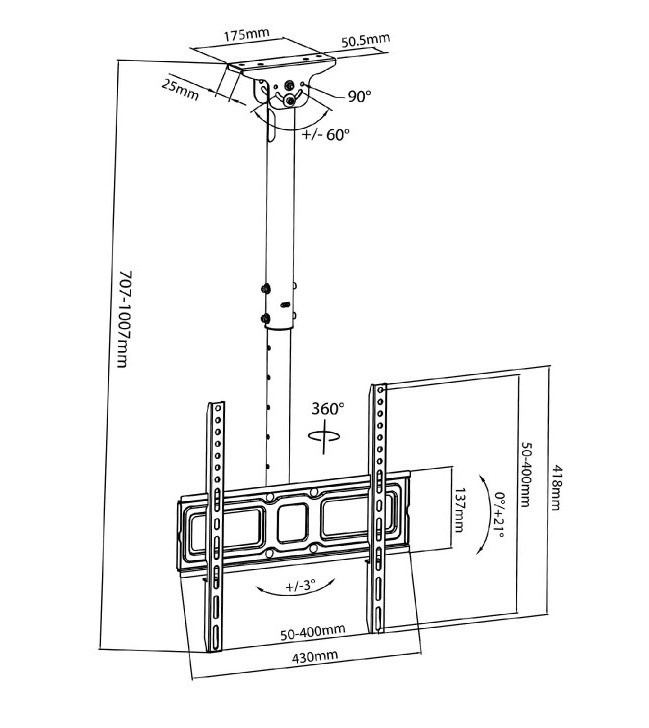 Stropní výsuvný držák na Tv Fiber Mounts M9C43 Stropní (nástěnný) držák na Tv 32-60", nastavení délky 717-1017mm, naklápění 0-21°, VESA 75x75 až 400x400, nosnost 35kg Kvalitní stropní držák na televize nebo monitory s úhlopříčkou 32-60". Držák má nastavitelnou délku od 717mm do 1017mm, umožňuje otáčení a naklápění Tv, uchycení je možné na rovné i šikmé stropy (nebo podkrovky), případně i na stěnu nebo bok stropního trámu - stropní úchyt je variabilní a umožňuje velké úhlové polohování. Veškerou kabeláž snadno ukryjete do těla držáku. Podpora VESA 75*75 až 400*400, nosnost 35kg. Materiál ocel, dodáváno včetně instalačního materiálu. Kvalitní ale levný stropní držák na Tv 32-60" s nastavením délky, otočný a sklopný Fiber Mounts M9C43 Technické údaje: nosnost 35kg podpora VESA standardů 75*75 až 400*400 vhodný na televize i monitory s úhlopříčkou 32-60" nastavitelná délka držáku 717-1017mm naklápění 0° až 21° korekce roviny +/- 3° otočný +/- 180° uchycení na rovné nebo šikmé stropy, na stěny nebo svislé povrchy systém pro skryté vedení kabeláže materiál ocel instalační materiál barevné provedení černé záruka 5 let Úhlově polohovatelný úchyt stropního držáku Tv Fiber Mounts M9C43 Držák podporuje VESA standardy: VESA 75*75 VESA 100*100 VESA 200*100 a 100*200 VESA 200*200 VESA 300*200 a 200*300 VESA 300*300 VESA 400*200 a 200*400 VESA 400*300 a 300*400 VESA 400*400.