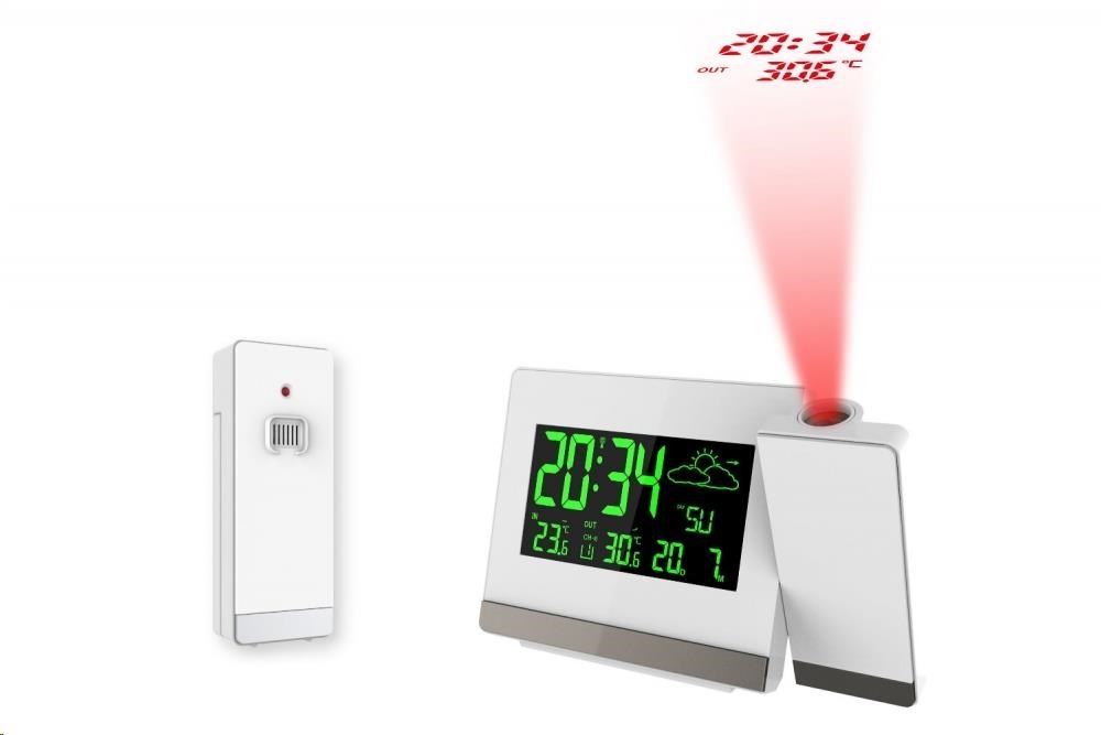 Meteorologická stanice s budíkem a projekcí času a vnější / vnitřní teploty, předpovědí počasí a barevným inverzním s možností volby nastavení zobrazení až z 256 barev. barevný inverzní displej o rozměrech 81 x 43 mm při napájení síťovým adaptérem má osvětlení displeje má tři stupně jasu a možnost vypnutí, poté lze krátkodobě zapnout na 15 s, projekce je stálá při napájení bateriemi lze krátkodobě zapnout osvětlení spolu s projekcí na 15 s lze nastavit 256 barev, nebo režim automatického plynulého střídání barev možnost rychlé volby 8 barev osvětlení displeje velikost číslic: čas 25 mm, datum 9 mm, zkratka názvu dne 8 mm, teplota 10 mm čas řízený signálem DCF-77 s možností manuálního nastavení ikona příjmu signálu DCF-77 12, nebo 24 hodinový formát zobrazení času datum, zkratka názvu dne (EN, FR, GE, SP, IT, NL, DK) časová zóna od -1 do +2 hodin 2 budící časy funkce opakovaného buzení (Snooze) po 5 minutách buzení zvukovým signálem (20 sekund 1 pípnutí za sekundu, 20 sekund 2 pípnutí za sekundu, 20 sekundy 4 pípnutí za sekundu a poté stálé pípání) střídavá projekce času a vnitřní / vnější teploty (teploty se střídají co 5 s) barva projekce červená 5 animovaných ikon předpovědi počasí (slunečno, polojasno, oblačno, srážky, silné srážky – možnost bouřek) možnost nastavení výchozí ikony předpovědi počasí měření vnitřní teploty, měření vnější teploty bezdrátovým čidlem paměť na maximální a minimální naměřené hodnoty vnitřní a vnější teploty zobrazení teploty ve °C, nebo °F šipky vývoje vnitřní a vnější teploty šipka vývoje barometrického tlaku možnost použití až 3 bezdrátových čidel model TX205 (jedno je součástí dodávky) bezdrátový přenos hodnot vnější teploty na frekvenci 433 MHz indikace slabých baterií barva bílá rozměry 150 x 95 x 43 mm napájení síťový adaptér 230 - 240 V, 50 Hz, 50 mA / 4,5 V, 150 mA, 2 ks baterií 1,5 V typ AAA Bezdrátové čidlo (TX205) voděodolný kryt dosah signálu bezdrátového čidla až 30 m v otevřeném prostoru barva bílá indikace vysílání LED diodou rozměry 103 x 27 x 40 mm napájení 2 ks baterií 1,5 V typ AA Obsah balení: 1 x hlavní jednotka WT 549 1 x bezdrátové čidlo TX205 1 x síťový adaptér návod CZ, EN, PL, GE, FR, SP, IT, NL.