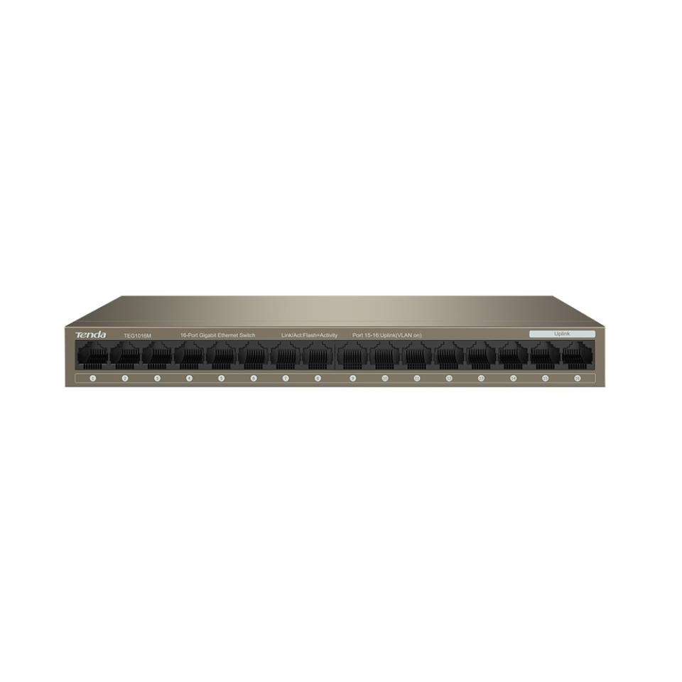 Gigabitový 16ti portový switch TEG1016M výrobce Tenda Technology, plně podporuje standardy IEEE 802.3, 802.3u, 802.3x, 802.3ab a je určený pro použití ve firmách i domácnostech. Tenda TEG1016M přepíná data v síti pomocí 16ti portů RJ45 s přenosovou rychlostí 10/100/1000 Mb/s a automatickou detekcí rychlosti. Maximální propustnost je 32 Gb/s. Auto MDI/MDIX na každém z portů. Přepojování uzlů v režimu Store-and-Forward. Full-duplex kontrola toku 802.3x. Navíc obsahuje tlačítko pro zapnutí VLAN. Switch je napájen externím zdrojem 12V DC, 1000mA. Maximální spotřeba 12 Watt. Montáž na stěnu, kovové provedení.
