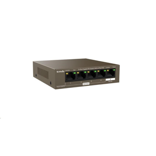 Tenda TEG1105PD - 5-port PoE PD Gigabit Ethernet Switch, 1x PoE IN, 4x PoE OUT, Kov, Fanless