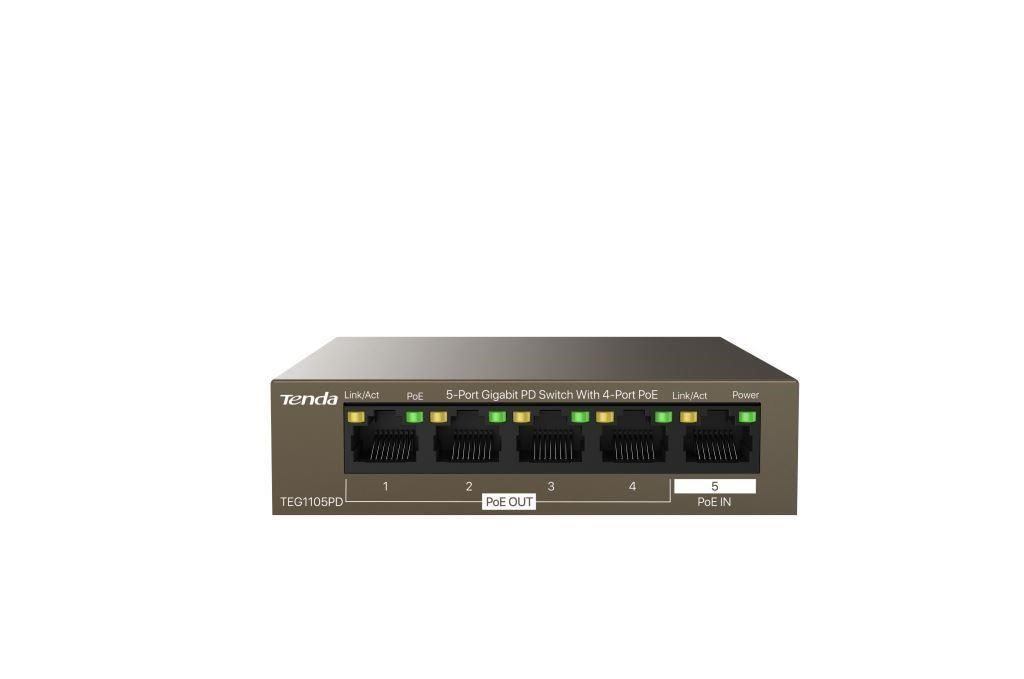 Tenda TEG1105PD přepíná data pomocí 5ti portů RJ45 s přenosovou rychlostí 10/100/1000 Mb/s s automatickou detekcí rychlosti. Port 5 je určen pro připojení do sítě a také pro napájení switche. Je nutné do tohoto portu "posílat" také PoE napájení IEEE 802.3at 30W z předchozího zařízení v síti. Zbývající 4 PoE porty podporují PoE 802.3af pro napájení dalších koncových zařízení. Switch podporuje stabilní 8 jádrové PoE napájení, ochrana proti přepětí 6kV. Podpora přepojování uzlů v módu Store-and-Forward. Full-duplex kontrola toku 802.3x, half-duplex kontrola toku v režimu Back-Pressure. Switch je také vhodný do kanceláří, jelikož neobsahuje žádné ventilátory, je fanless. Tenda TEG1105PD je vhodná jak do velkých náročných projektů, ale také do menších a středních firem a domácností.
