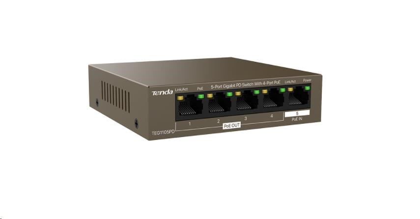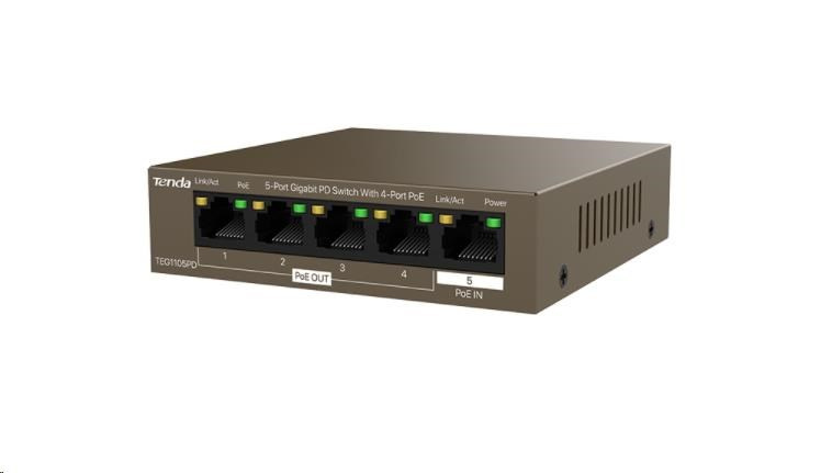 Tenda TEG1105PD - 5-port PoE PD Gigabit Ethernet Switch, 1x PoE IN, 4x PoE OUT, Kov, Fanless