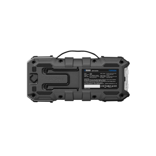 Startovací zdroj TOPDON V3000 je výkonově silný startovací booster a powerbanka v jednom je navržen pro náročné podmínky a vozidla s 12 V systémem (osobní auta, SUV, pick-upy, menší nákladní vozidla). Disponuje špičkovým proudem až 3000 A, díky čemuž spolehlivě nastartuje benzínové motory až 9,0 l a naftové až 7,0 l.