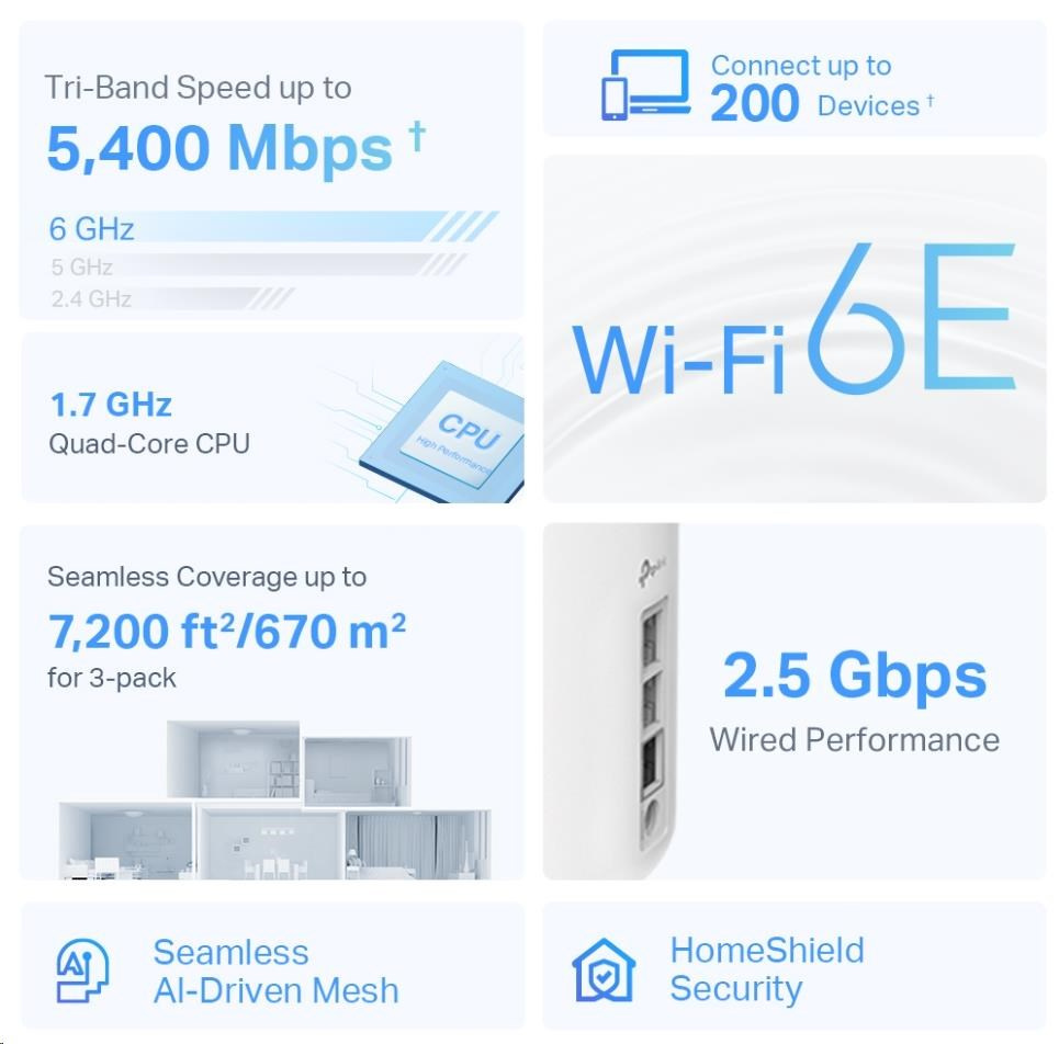 - Wi-Fi 6E pokrytí celé domácnosti – pokryjte plochu až 270 m2 ničím nerušeným Wi-Fi signálem příští generace a zapomeňte na mrtvé zóny pokrytí a načítání do vyrovnávací paměti
