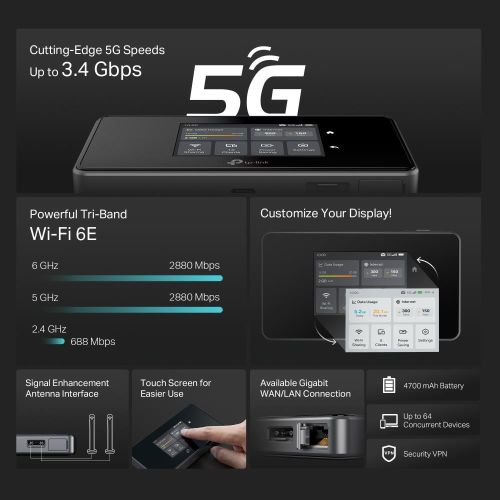 | Package Content | 5G AXE3600 Mobile Router M8550 Power Adapter USB-C Cable 4680 mAh Battery Quick Installation Guide |