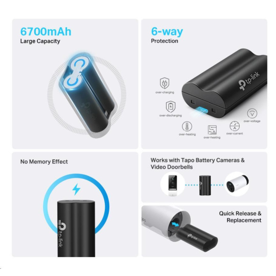 - 6700mAh Velká kapacita – Prodlužuje dobu používání (až 180 dní) vašich kamer Tapo napájených baterií a videozvonků.