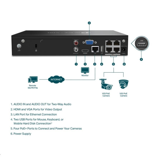 TP-Link VIGI NVR1004H-4P-2TB, videorekordér, 4 channels, 4xPoE, 1xSATA, 1x100Mb/s LAN, 2xUSB2.0, 1xHDMI,1xVGA