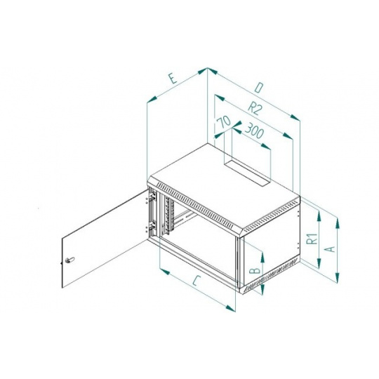 Rozvaděč Delta B je celosvařený nástěnný jednodílný rozvaděč s celoskleněnými dveřmi, které je možné díky masivním pantům otevřít pod úhlem téměř 180°. Důležitou součástí výrobku jsou otvory pro kabely, které jsou umístěny na horní a dolní stěně. Další dva otvory jsou umístěny na zadní stěně rozvaděče. Otvory jsou zaceleny vylamovacími záslepkami, které je možné vylomit s pomocí např. šroubováku. 19“ zařízení se instalují na vertikální lišty, které je možné plynule natavit podle potřeby do hloubky těla rozvaděče. Díky perforaci je zajištěna přirozená cirkulace vzduchu a chlazení komponentů. Přesné rozměry a další technické údaje jsou uvedeny níže (hodnoty R1 a R2 označují rozteče montážních otvorů pro zavěšení rozvaděče na zeď). Maximální zatížení rozvaděče je 30 kg. Rozměry: A – 900 mm B – 795 mm C – 490 mm D – 600 mm E – 395 mm R1 – 854 mm R2 – 420 mm Hmotnost – 26,6 kg Příbal: Klíč - přední dveře 2x Vrut 6x50 4x Podložka 6,6 4x Hmoždinka 10 4x Plastová podložka 8x Plovoucí matice M6 8x Šroub M6x16 8x Protiprachová záslepka 1x.