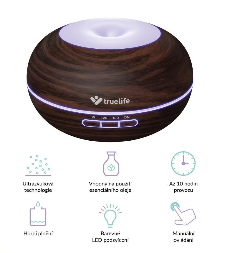 Difuzér Truelife provoní vzduch v místnosti během chvilky, stačí do nádržky přidat pár kapek esenciálního oleje. Ať už jste milovníky aromaterapie, chcete si vytvořit příjemnou relaxační atmosféru nebo vás trápí nepříjemné pachy z okolí, difuzér pro vás bude ideálním pomocníkem. Funguje na principu ultrazvuku, který mění vodu v nádržce na jemnou páru. Na výběr máte ze 14 variant barevného LED podsvícení. Potěší vás jistě i svým originálním, a přesto nadčasovým designem.