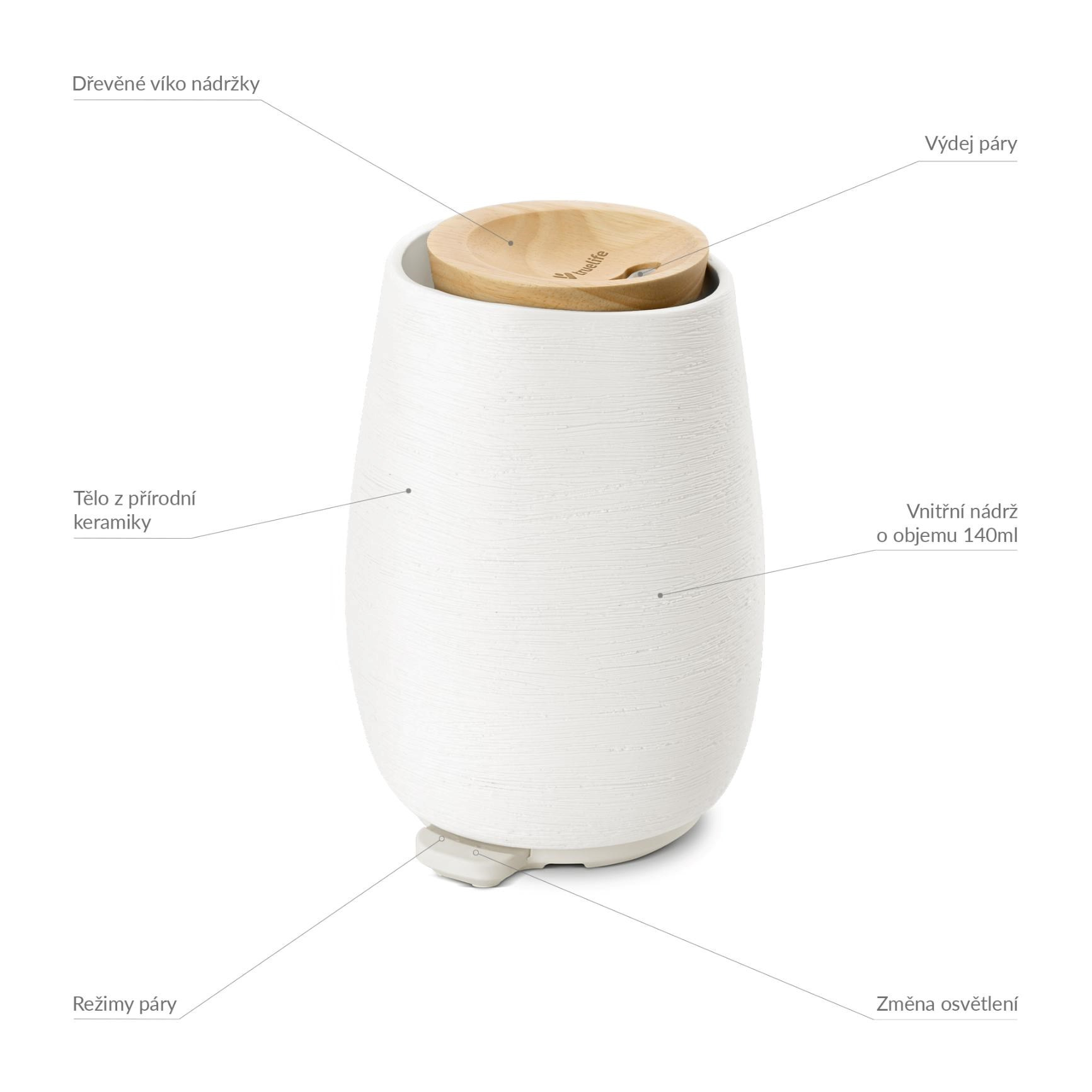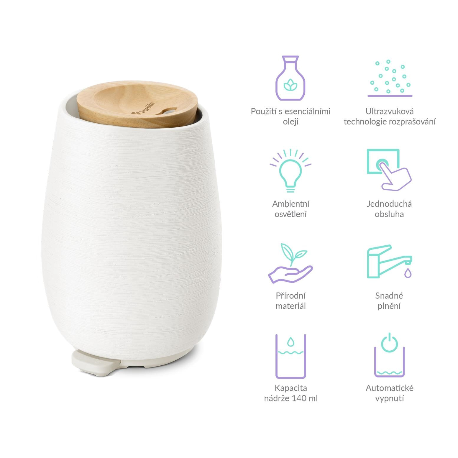 Difuzér TrueLife AIR Diffuser D8 z přírodních materiálů, užití jako zvlhčovač nebo s esenciálními oleji, oddělitelná nádržka na 140 ml, ambientní osvětlení, 5 h provozu, 2 režimy, automatické vypnutí, ultrazvuková technologie..... více