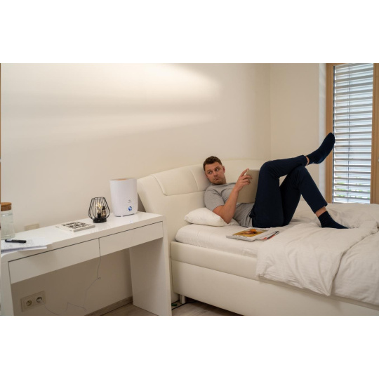 Vodní nádrž zvlhčovače má kapacitu 3 l a vystačí na 24 hodin provozu při maximálním výkonu. Bez obav tedy můžete zvlhčovač nechat zapnutý i na noc, díky nízké hlučnosti dosahující maximálně 35 dB vás nebude při spánku rušit. Díky automatickému indikátoru nedostatku vody se zvlhčovač při nízkých hladinách vody sám vypne. Nehrozí tak zkrat ani přehřátí.