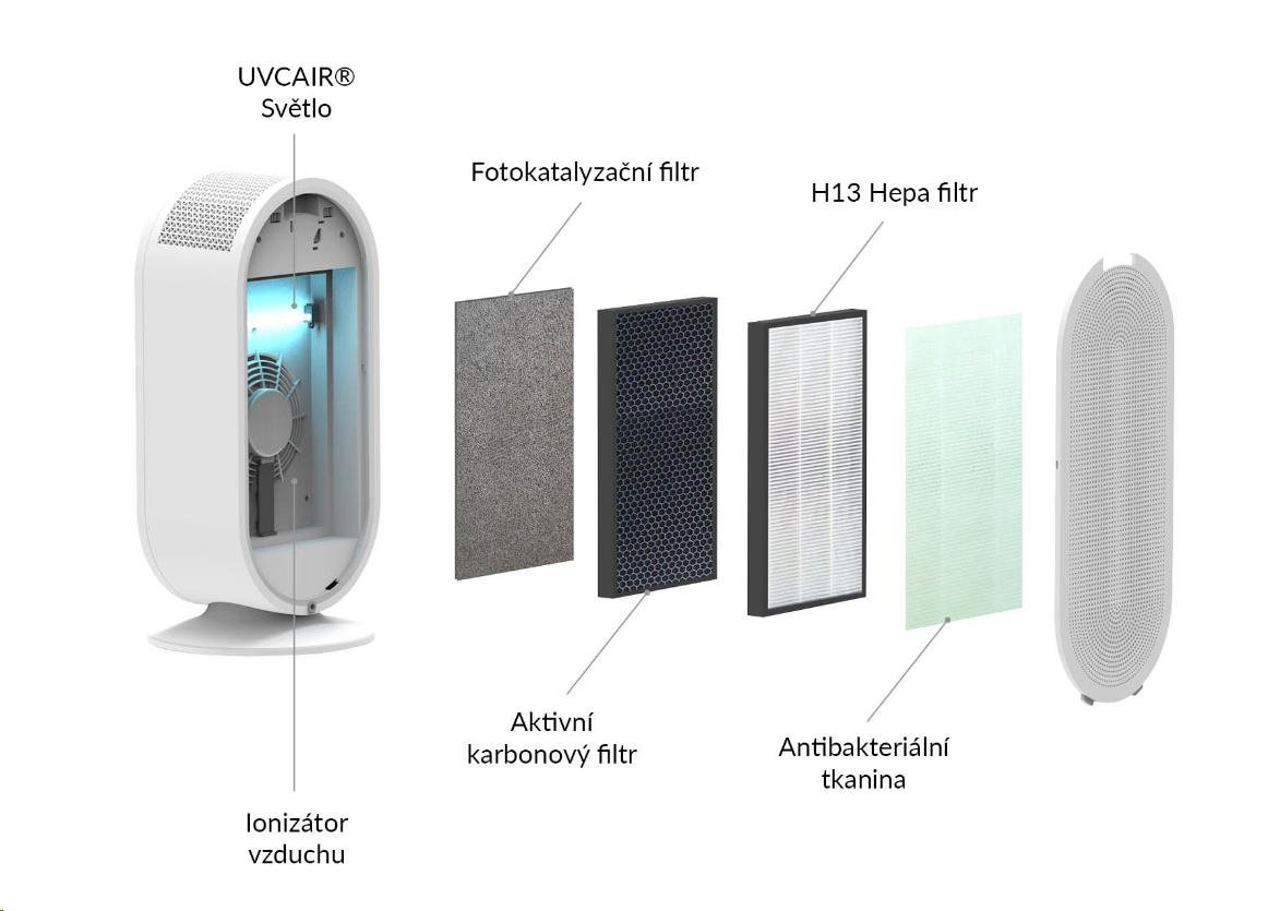 Čistička je vybavena sterilizační UV lampou, která díky technologii UVCAir® pomáhá efektivně ničit mikroby a viry a zlepšuje tak celkovou kvalitu ovzduší ve vaší domácnosti. Jistě vás potěší i přítomnost ionizátoru. Technologie IonTrue® zvyšuje koncentraci záporných iontů. Dostatek záporných iontů ve vzduchu prospěšně ovlivňuje naše zdraví, má pozitivní dopad na naši psychiku i soustředění a může pomoci i s bolestmi hlavy. Díky ionizátoru čistička obohacuje vzduch o záporné ionty, zbavuje vzduch prachových částic a vzduch poté lépe okysličuje krev.