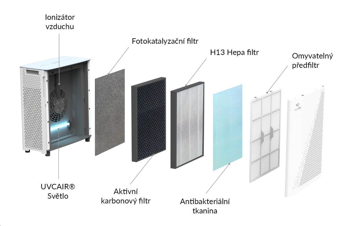Čistička vzduchu TrueLife vyčistí až 310 m3 vzduchu za hodinu. Je vhodná do místnosti o velikosti 35-40 m2, můžete jí bez obav přenášet. Čistička celkově zlepšuje kvalitu vzduchu, ničí viry, bakterie a další nečistoty a může tak významně pomoci alergikům nebo astmatikům. Čistička je opatřena barevnými indikátory kvality vzduchu, funkcí automatické detekce nečistot a automatického čištění. Bydlíte-li na místě, kde se často práší, potěší vás přítomnost prachového senzoru. 7 násobná filtrace v podobě předfiltru, anti-bakteriálního filtru, HEPA filtru, uhlíkového filtru, katalytického filtru, UV světla a ionizace zachytí až 99,9% polétavého prachu a vyčistí 93,5 % těkavých organických látek. Zároveň zachycuje i viry a koronaviry.