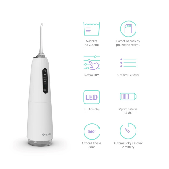 Dopřejte si dokonalou každodenní dentální hygienu s pomocí dobíjecí ústní sprchy TrueLife AquaFloss Compact C200. Její užití je šetrnější než v případě zubních nití a mezizubních kartáčků, zároveň přináší i úsporu peněz. Většina zubních kazů má svůj původ v mezizubních prostorech, ale díky technologiím StreamTrue®, PulseTrue® a 5 režimům čištění nemají šanci. U režimu DIY si navíc přizpůsobíte tlak dle potřeby. Nádržka o objemu 300 ml pojme dostatek vody na celé čištění, které trvá 2 minuty, což ohlídá automatický časovač. Ústní sprcha je vybavena dvěma způsoby plnění vodou - z boku a shora. Praktické plnění horním otvorem je rychlejší a uživatelsky přívětivější než plnění z boku, kterým disponují standardní ústní sprchy. Použití ústní sprchy je tak pohodlné a šetří čas. Baterie sprchy vydrží při užití 2x denně až 14 dní. Kompaktní design přístroje umožňuje jeho snadné sbalení i na cesty, zabudovaný LCD displej zobrazuje zvolený režim a stav baterie. Funkce paměť zajišťuje, že se při opětovné aktivaci sprchy spustí naposledy použitý režim. Sprcha pokrývá prostřednictvím přibalených 4 trysek různé dentální potřeby.
