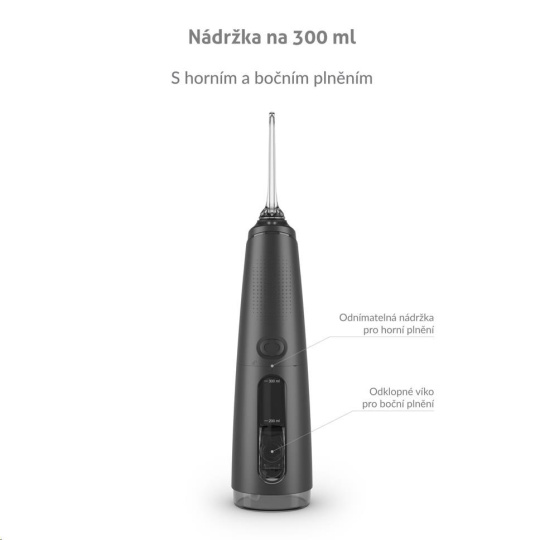 Nádržka o objemu 300 ml vystačí na vyčištění celého chrupu a zároveň je dostatečně kompaktní. Kromě obyčejné vody jí můžete naplnit ústní vodou pro extra svěžest.