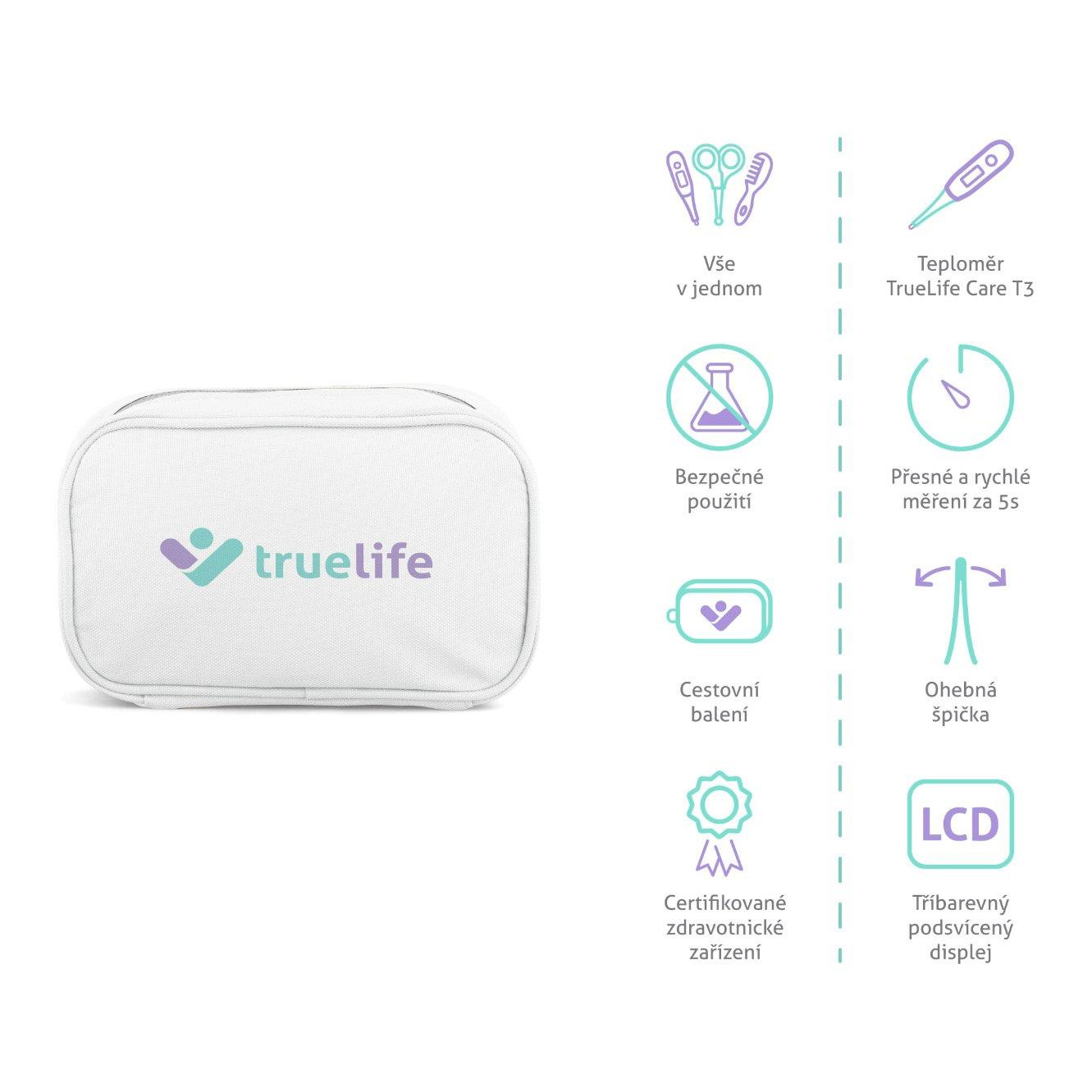 Kompletní sada pro péči o dítě, cestovní pouzdro, nůžky, kleštičky, pilníky na nehty, kartáč na vlasy s jemnými štětinami, hřeben, zubní kartáček na prst, odsávačka hlenů, teploměr TrueLife Care T3 - měření za 5 vteřin, ohebná špička, tříbarevný displej..... více