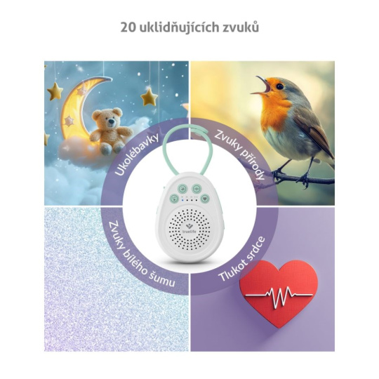 Z 20 zvuků, mezi nimiž je 5 melodií, 9 zvuků přírody, 5 zvuků bílého šumu a 1 zvuk tlukotu srdce, si určitě vybere ten svůj každé děťátko.