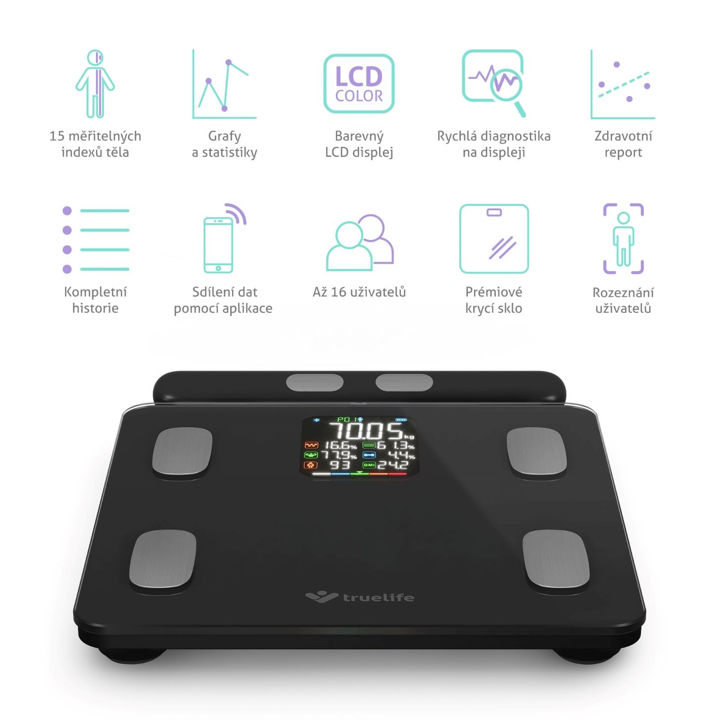 TrueLife FitScale W8 BT Black pomocí Bluetooth snadno propojíte s aplikací, která je kompletně v češtině, přináší řadu výhod a rozšiřuje možnosti osobní váhy. Během vážení se údaje automaticky s aplikací synchronizují, a to až pro 16 uživatelů. Přehledný report pak nabízí 15 indexů těla s detailním vysvětlením a doporučením týkajícím se stravy a cvičení, jak postupovat k vytyčenému cíli. Z 15 posledních měření vytvoří aplikace i grafy a statistiky, aby byl vývoj zřetelnější. Data lze synchronizovat také s aplikacemi Moving life, Apple Health, Google Fit a Fitbit.