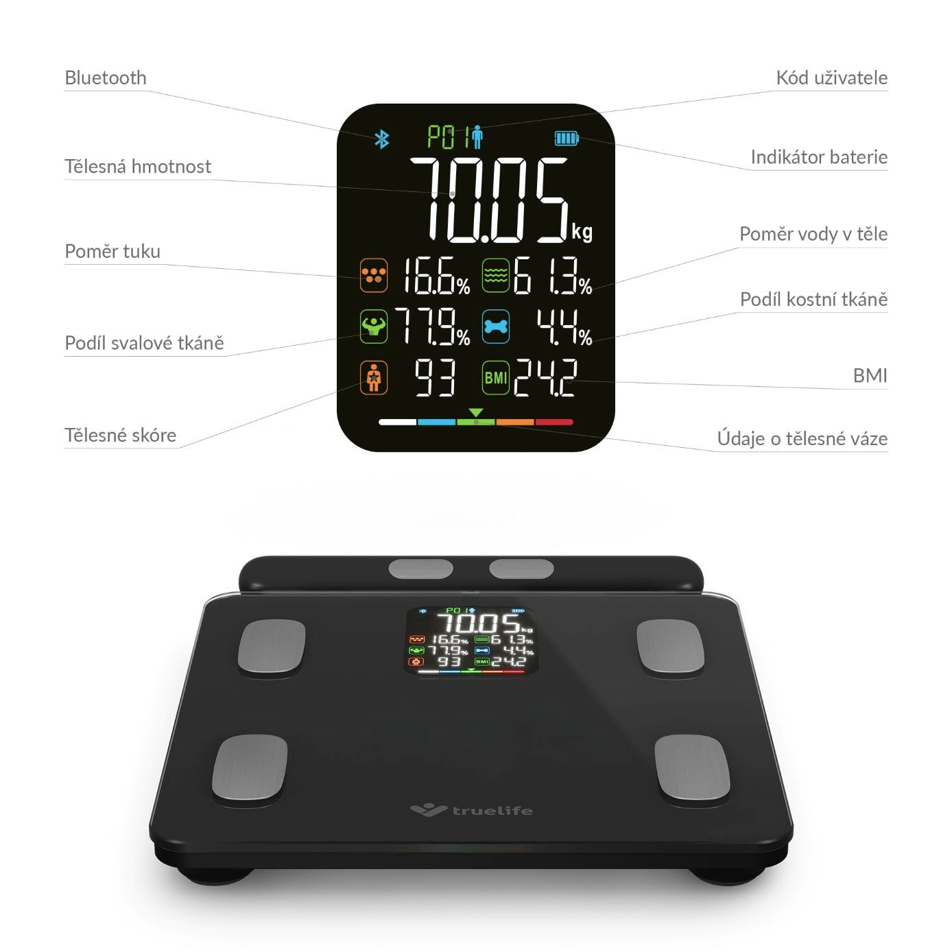 Zjistěte o svém těle více než jen pouhou hmotnost. Každý jsme originál a jedinečnou skladbu má i naše tělo, proto o něm chytrá váha TrueLife FitScale W8 BT Black prozradí detaily. Technologie TrueLife PrecisionIQ+® využívá 8 vysoce citlivých senzorů a s pomocí bioelektrické impedanční analýzy změří celkovou tělesnou kompozici. Na přehledném barevném LCD displeji zobrazí celkem 7 údajů - kromě hmotnosti také třeba procento tuku, svalů či vody. Propojením přes Bluetooth s aplikací získáte přehledný report zahrnující 15 tělesných indexů včetně jejich popisu. Váha je schopna sledovat až 16 uživatelů, u kterých v aplikaci zaznamená 15 posledních měření. Každého uživatele automaticky rozezná, takže není třeba nic přepínat. Kdokoliv má však možnost použít váhu i bez aplikace. Prémiové tvrzené krycí sklo je elegantní a velmi odolné s nosností až 180 kg. Při vážení si můžete zvolit jednotky, a to buď kilogramy nebo libry. Vážící odchylka činí pouhých 0,1 kg, takže vaše výsledky budou opravdu přesné.